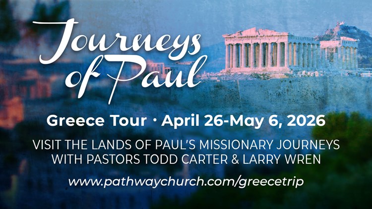 Join Dr. Todd Carter, Pastor Larry Wren, and Pathway Church on the Journeys of Paul in Greece tour from Wichita, Kansas, on April 26, 2026. Journey to Amphipolis, Philippi, Neapoli (Kavala), Thessaloniki, Veria (Berea), Meteora, Delphi, Mykonos, Ephesus, Patmos, Crete, Santorini, Corinth, and much more.